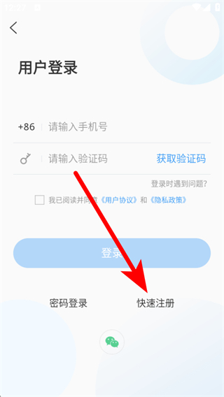 3、在登錄注冊界面,點擊快速注冊按鈕,進入用戶注冊頁面。
