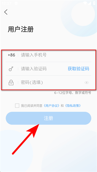 4、在頁面輸入手機號并填寫驗證碼,點擊注冊完成賬號注冊操作。