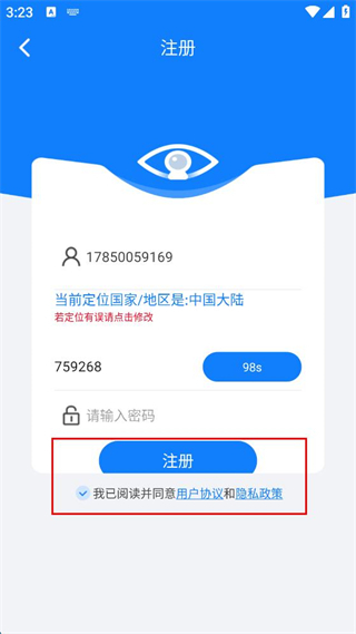 3、輸入密碼,勾選我已閱讀并同意用戶協(xié)議和隱私政策,點(diǎn)擊注冊。