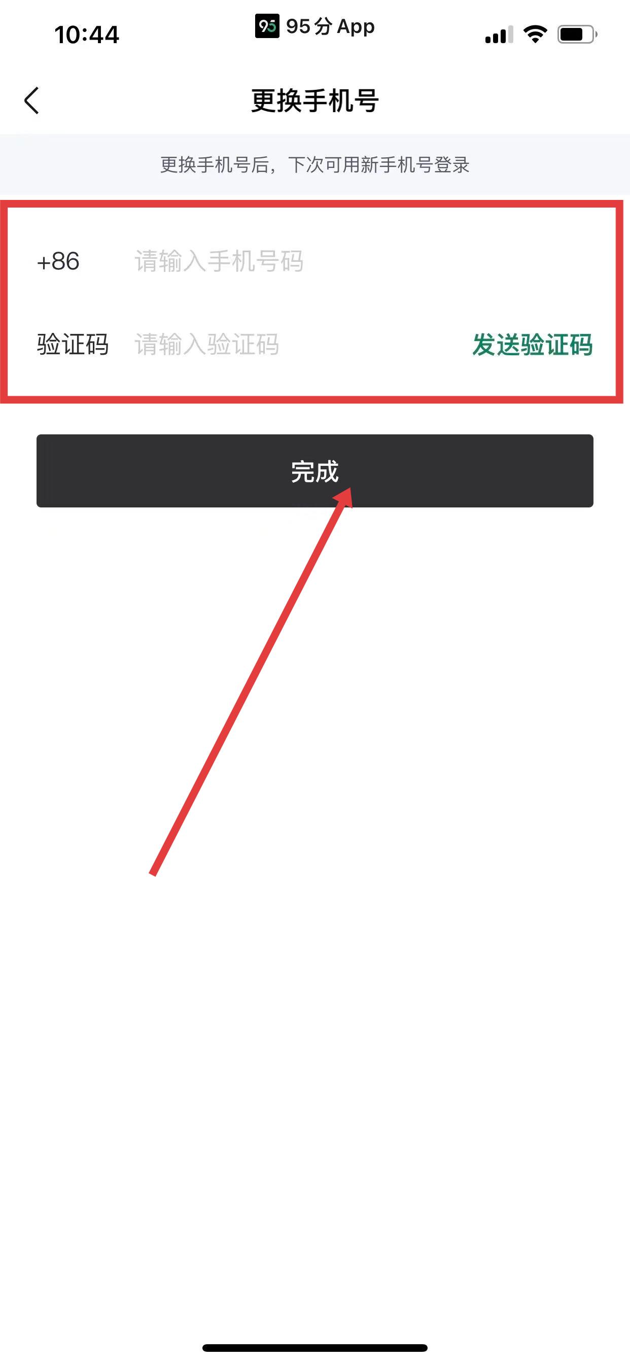 4、輸入新手機(jī)號(hào),點(diǎn)擊發(fā)送驗(yàn)證碼,填入新驗(yàn)證碼后點(diǎn)擊完成,完成手機(jī)號(hào)更換。