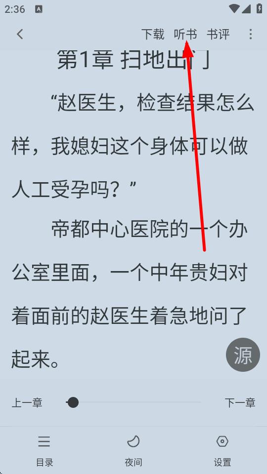 3、在小說閱讀界面中,點(diǎn)擊屏幕上方的聽書選項(xiàng)。