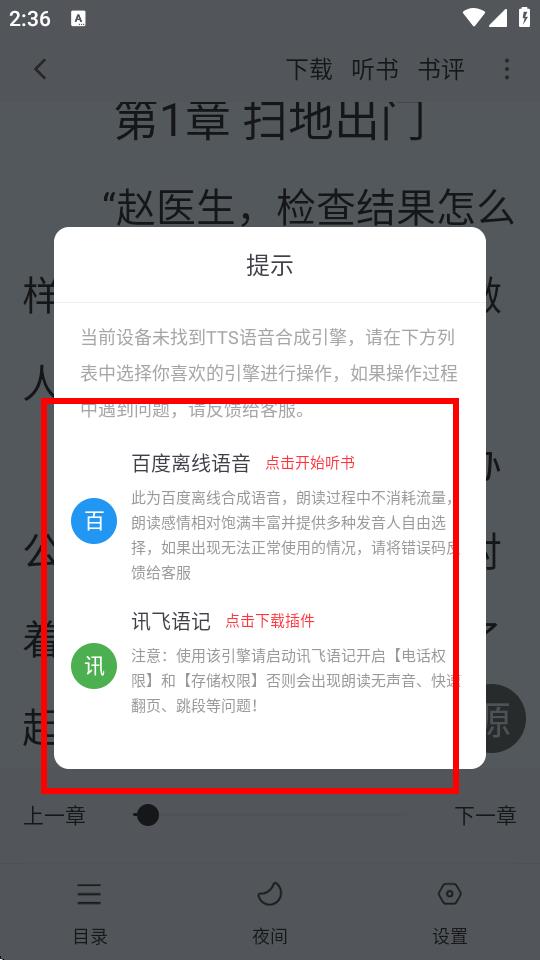 4、若當(dāng)前設(shè)備未找到TTS語音合成引擎,會彈出提示框,在提示框中選擇喜歡的語音引擎,點(diǎn)擊下載插件后使用,即可開啟聽書模式。