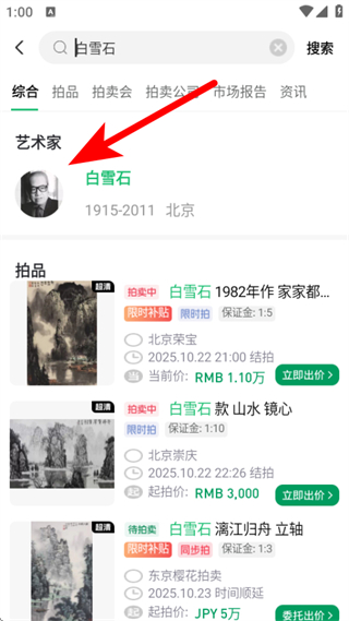 3、在搜索結(jié)果中,點擊藝術(shù)家條目,進入藝術(shù)家頁面查看其拍品信息。