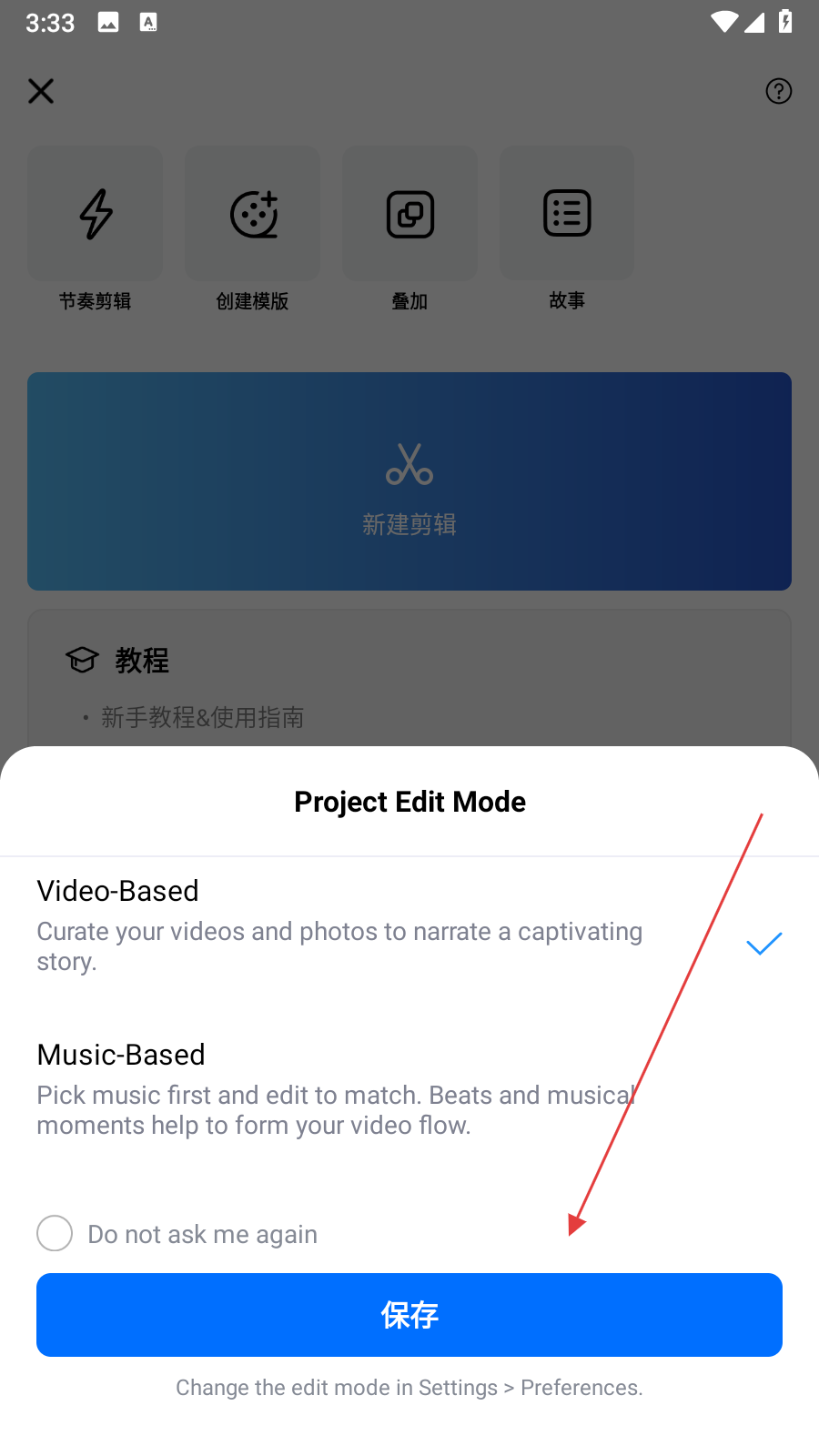 2、在Project Edit Mode彈窗中,根據(jù)需求選擇Video-Based或Music-Based模式,點擊保存。
