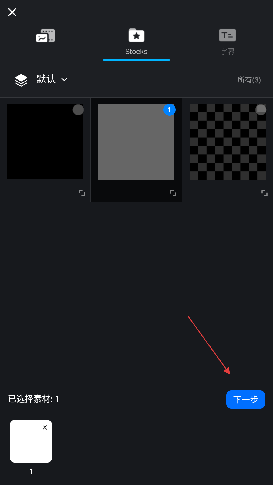 3、進入素材選擇界面,從Stocks或本地相冊中選取需要剪輯的視頻/圖片素材,選好后點擊下一步。