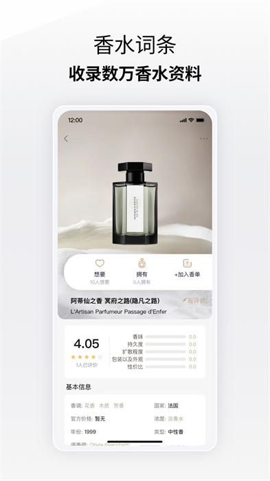 香水百科:收錄了十幾萬瓶香水數(shù)據(jù)并持續(xù)更新,可以查詢到任意香水的香調(diào)、調(diào)香師生平和品牌故事