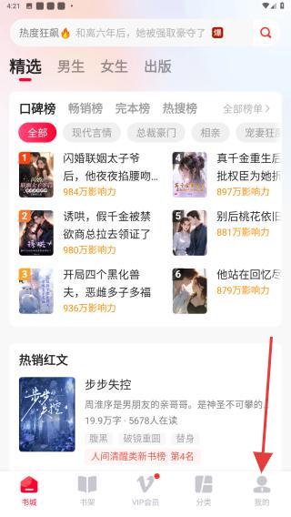 1、啟動熱門小說大全APP進入到首頁,點擊右下角導(dǎo)航欄處的我的圖標(biāo)。
