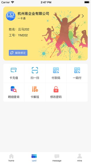 易正為各大企業(yè)提供一卡通平臺(tái),員工可以利用一卡通進(jìn)行各種刷卡,無(wú)論是公司門禁還是娛樂(lè)消費(fèi)都可以直接使用一卡通,讓企業(yè)里的員工更加方便。同時(shí)里面還可以查詢自己的每筆具體的賬單,還可以進(jìn)行在線繳費(fèi)。還有各種表單也是可以直接填寫的,歡迎有需要的朋友下載使用!