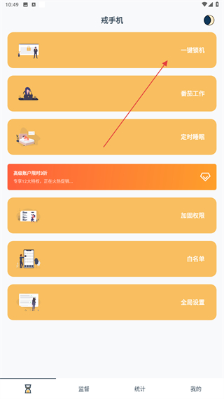 1、打開戒手機app,進入到首頁內(nèi)點擊一鍵鎖機的按鈕。