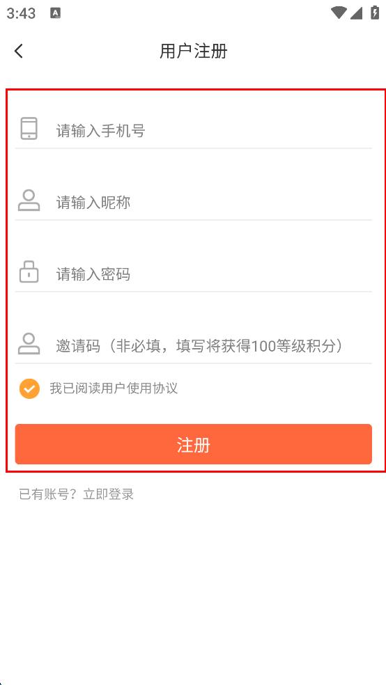 3、在用戶注冊頁面,依次輸入手機號碼、昵稱、密碼,邀請碼非必填可根據(jù)需求填寫,然后勾選“我已閱讀用戶使用協(xié)議”。