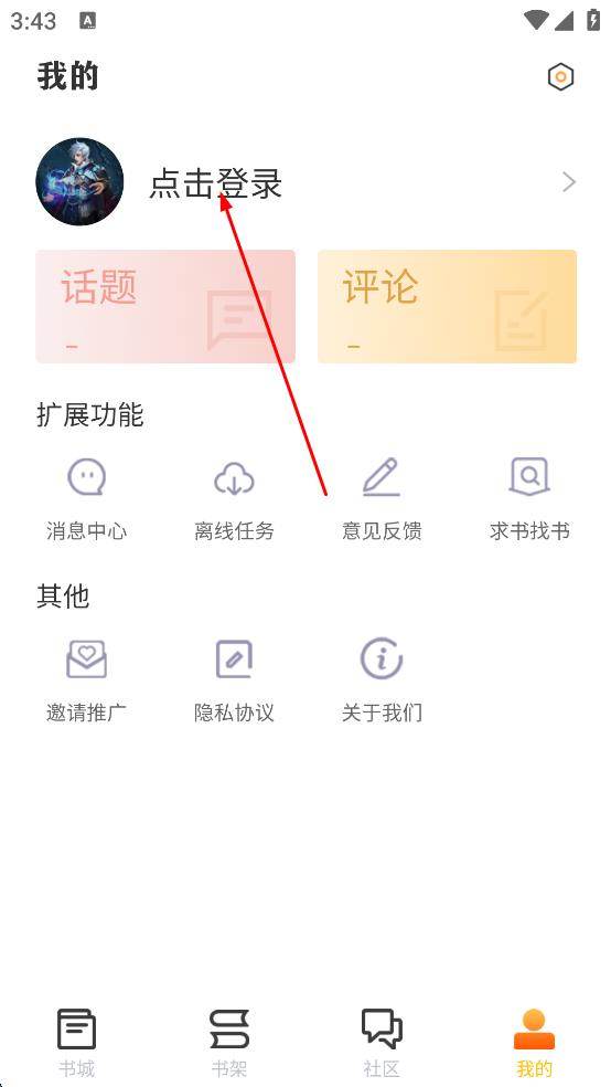 1、打開閱讀類APP,進入主界面后,點擊右下角“我的”,進入個人中心頁面,點擊“點擊登錄”。