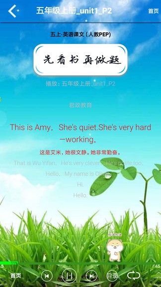 君政教育五年級(jí)英語(yǔ)上冊(cè)人教版app學(xué)習(xí)內(nèi)容全部免費(fèi),打開(kāi)就能用!課本結(jié)合,教材同步,方便課前預(yù)習(xí),課后復(fù)習(xí)。 單詞聽(tīng)力練習(xí),增強(qiáng)記憶,能夠輕松聽(tīng)懂英語(yǔ)。 單詞跟讀練習(xí),開(kāi)口讀英語(yǔ),練就一口流利的英語(yǔ)。