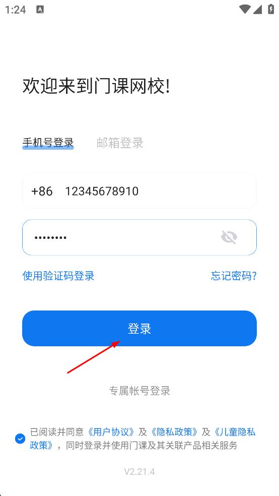4、勾選已閱讀并同意相關(guān)協(xié)議和政策,點(diǎn)擊登錄,即可完成門課網(wǎng)校的登錄。