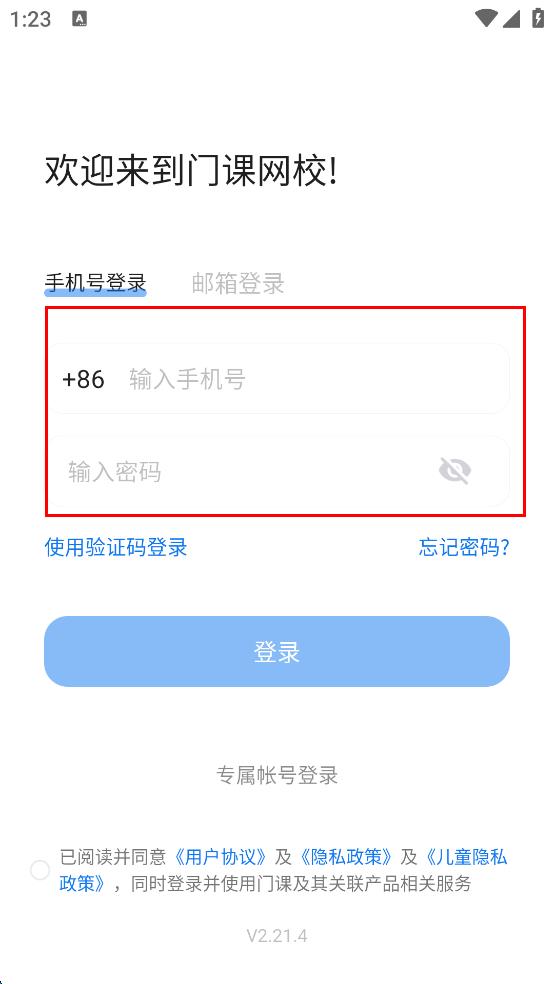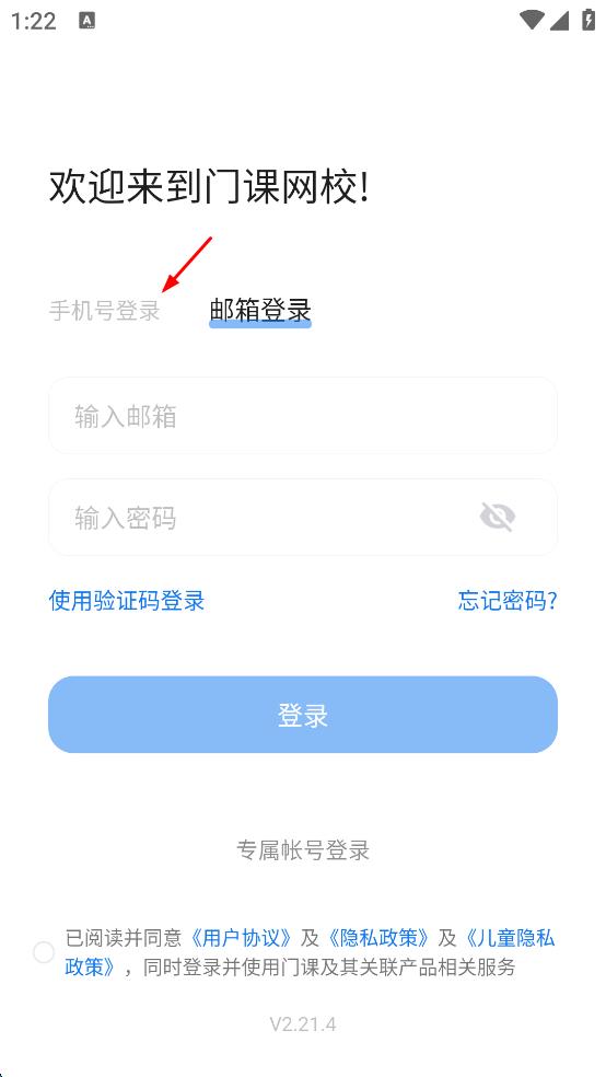 2、在門課網(wǎng)校登錄頁面,點(diǎn)擊手機(jī)號登錄,進(jìn)入手機(jī)號和密碼輸入頁面。