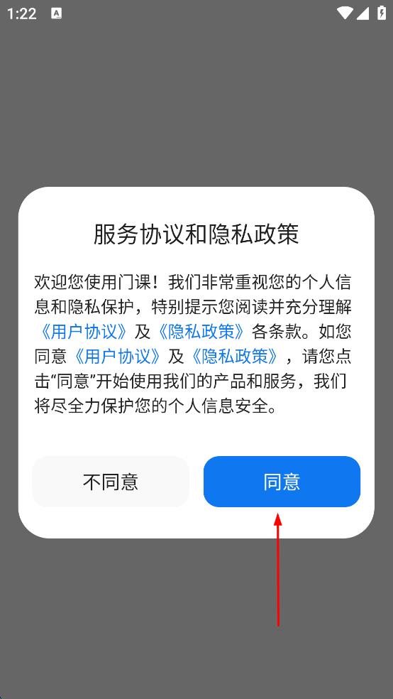 1、打開門課,在彈出的服務(wù)協(xié)議和隱私政策頁面,點(diǎn)擊同意,進(jìn)入門課網(wǎng)校登錄頁面。