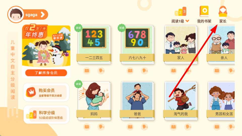 1、打開竹子閱讀app,進(jìn)入主界面后,點擊家長選項進(jìn)入家長中心。
