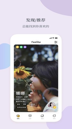 feelike是一款全新上線的社交聊天交友軟件,豐富的功能加上便捷的操作方式更有全新的匹配交友等你來加入,用戶可以設(shè)置問題進(jìn)行交友還有真實(shí)的認(rèn)證信息以及裝飾自己的主頁等等,軟件功能多多輕松認(rèn)識另一個ta。平臺采用雙重認(rèn)證模式,確保用戶信息真實(shí)可靠,讓你放心聊天,界面清新,操作便捷,為年輕人打造真實(shí)有趣的社交空間,喜歡的朋友趕緊來下載體驗吧。