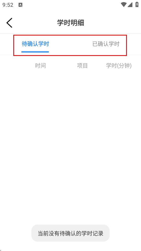 4、進(jìn)入學(xué)時明細(xì)頁面,切換查待確認(rèn)學(xué)時列表,即可找到確認(rèn)的學(xué)時記錄。