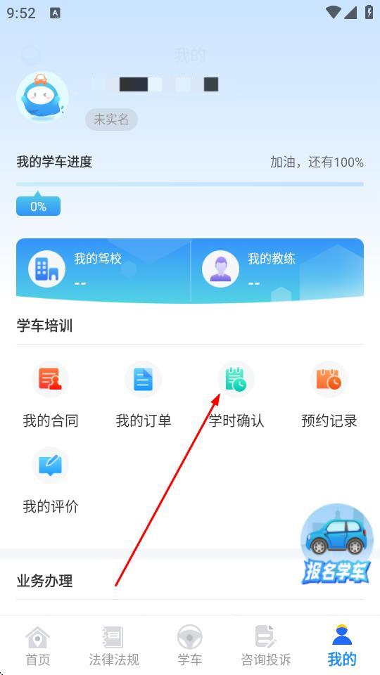 3、在我的頁面,找到學(xué)車培訓(xùn)板塊,點(diǎn)擊學(xué)時確認(rèn)按鈕。