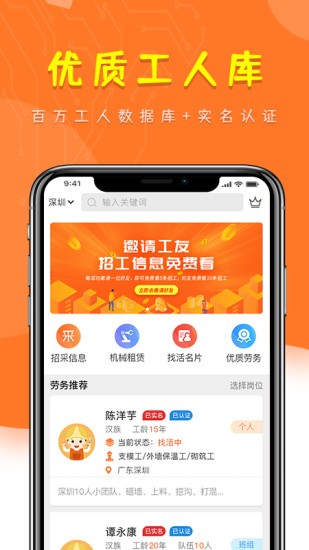 自動定位,智能推薦附近的優(yōu)質(zhì)勞務(wù)、工友名片。