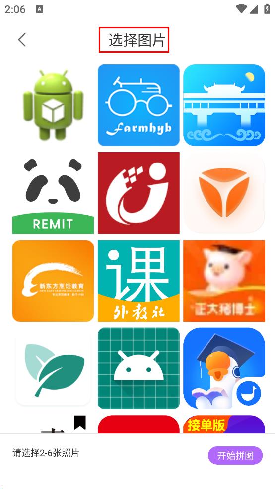 4、在選擇圖片頁面,挑選2 - 6張照片,選好后點擊“開始拼圖”,即可進(jìn)行拼圖操作。
