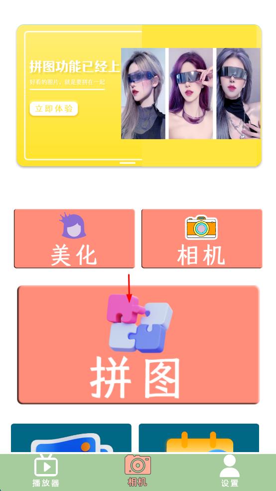 3、在相機功能頁面,找到“拼圖”按鈕,點擊該按鈕,進(jìn)入選擇圖片頁面。