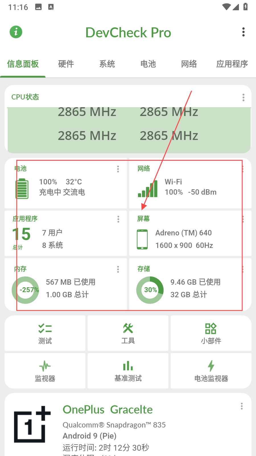 1、進(jìn)入信息面板,可查看CPU狀態(tài)、電池、網(wǎng)絡(luò)、應(yīng)用程序、屏幕、內(nèi)存、存儲等設(shè)備信息,也能使用測試,工具,小部件等功能,了解設(shè)備整體運行情況。