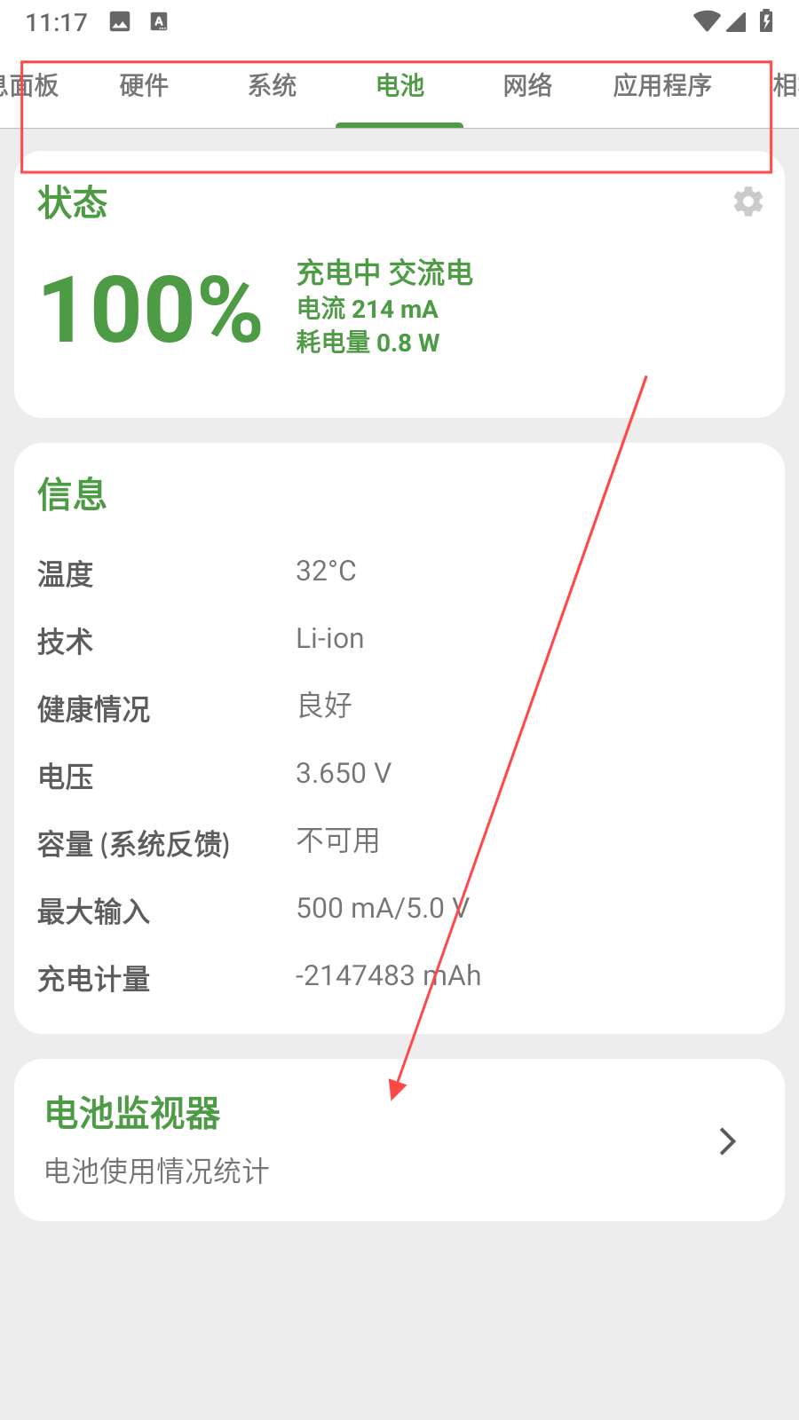 2、切換到電池頁面,能查看電池狀態(tài),包括充電情況、電流、耗電量等,還有電池信息如溫度、技術(shù)、健康情況等,點擊電池監(jiān)視器,可查看電池使用情況統(tǒng)計。