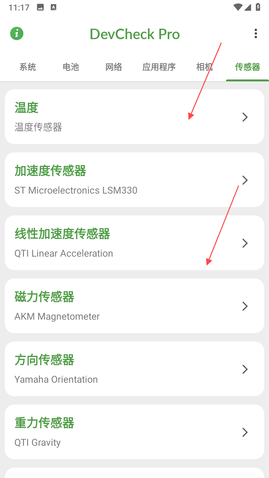 3、打開傳感器頁面,可查看溫度傳感器、加速度傳感器、線性加速度傳感器、磁力傳感器、方向傳感器、重力傳感器等各類傳感器信息,了解設(shè)備傳感器的具體情況。