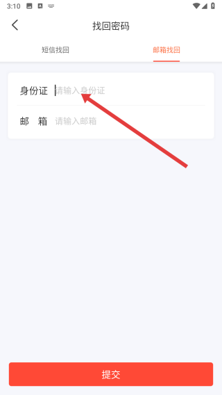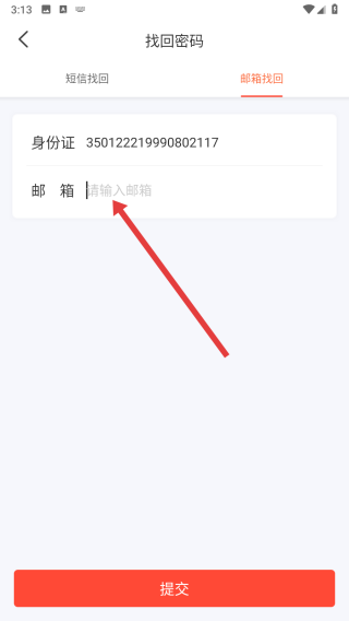 4、在填寫好身份證號(hào)后,繼續(xù)在下方填寫郵箱號(hào)碼,隨后點(diǎn)擊提交按鈕繼續(xù)找回操作。