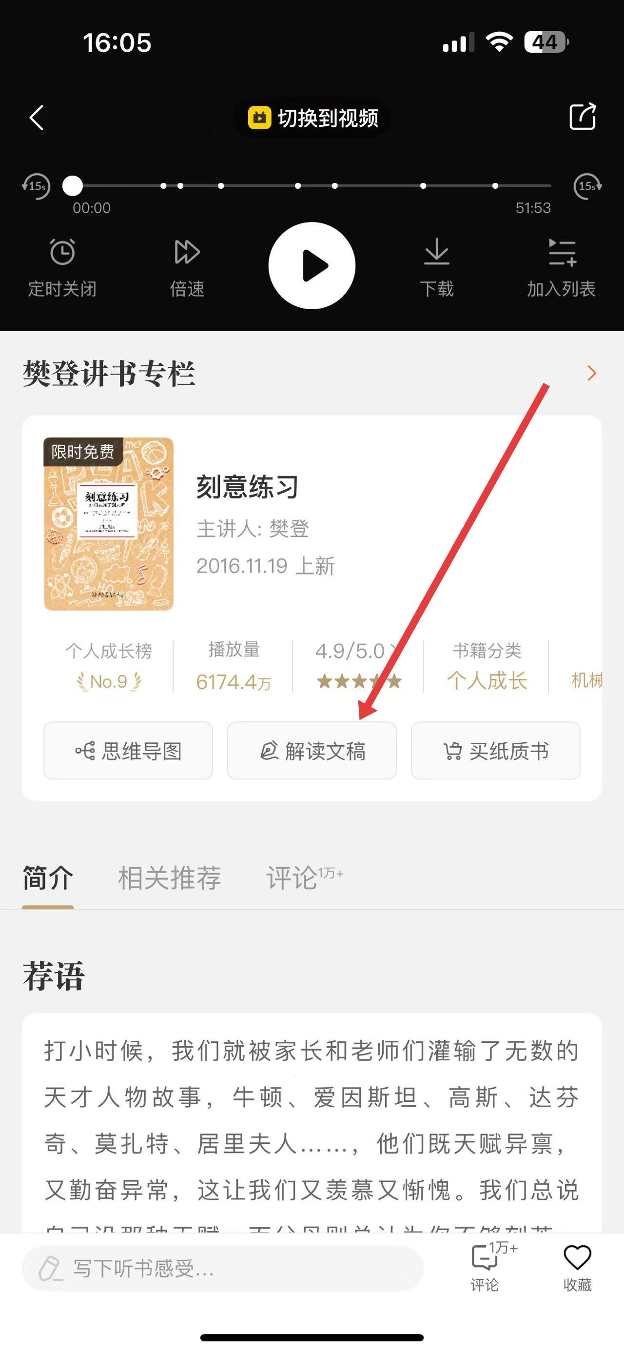 1、在帆書APP中進(jìn)入想聽書籍的頁面,如刻意練習(xí)書籍頁,點(diǎn)擊解讀文稿按鈕。