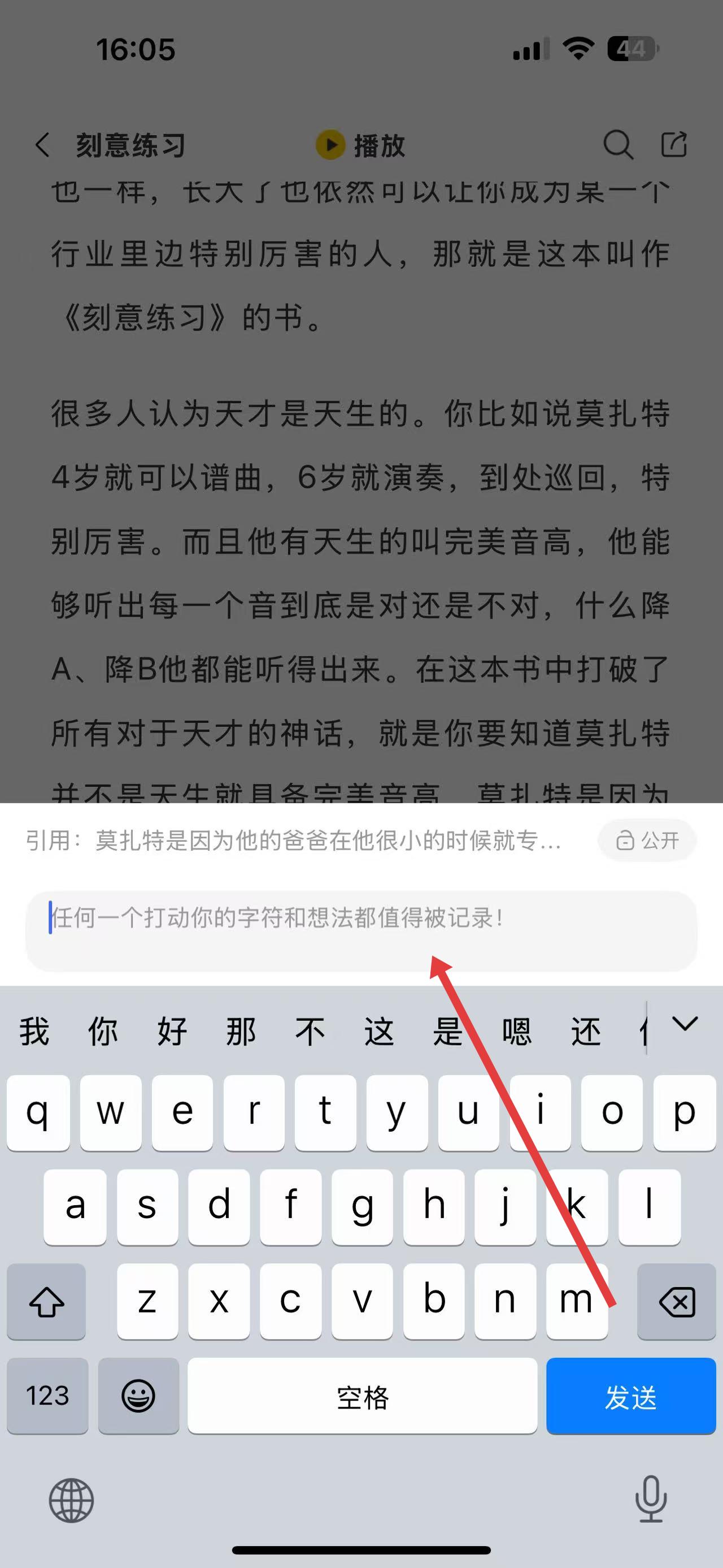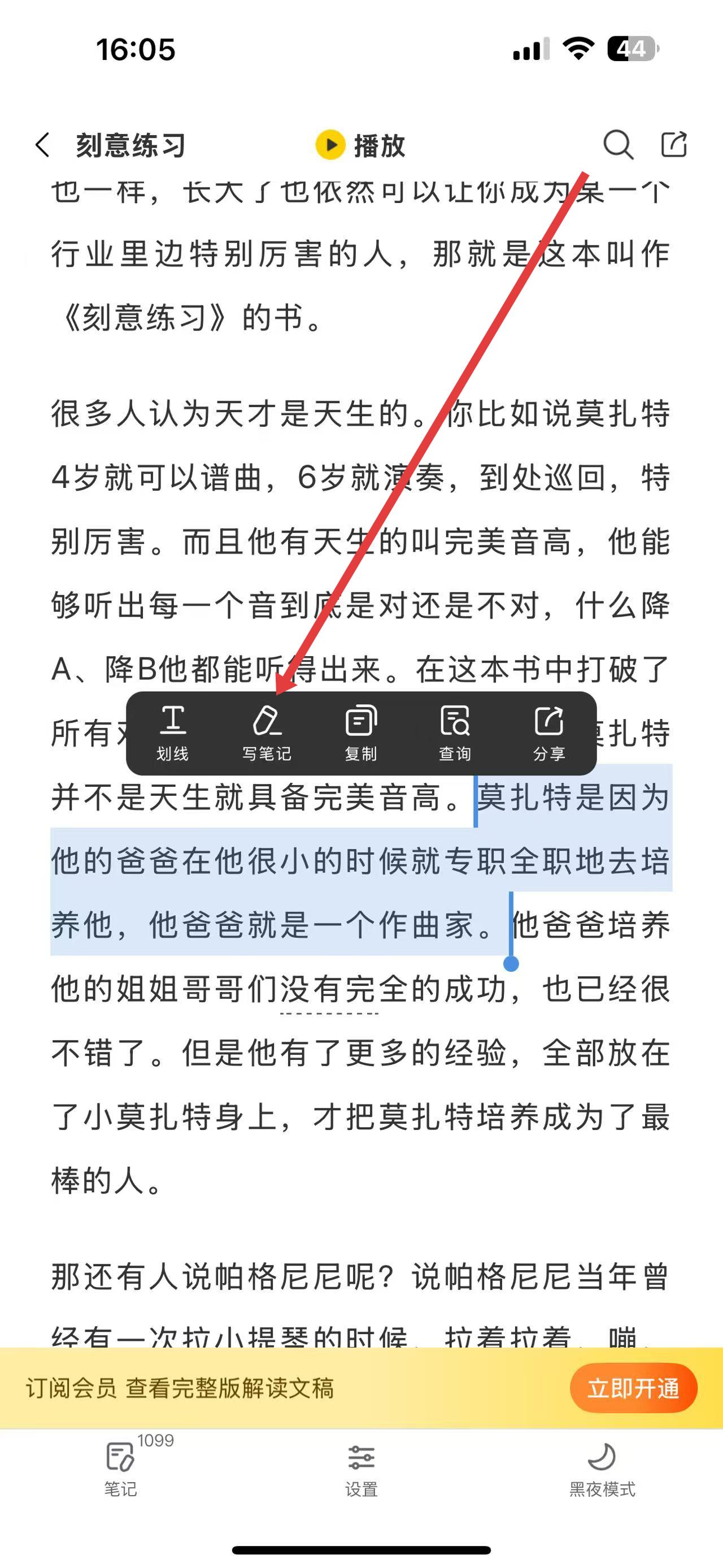 3、在彈出的操作菜單中點(diǎn)擊寫筆記,在下方輸入框中輸入想法或感悟,完成后確認(rèn)即可寫下筆記。