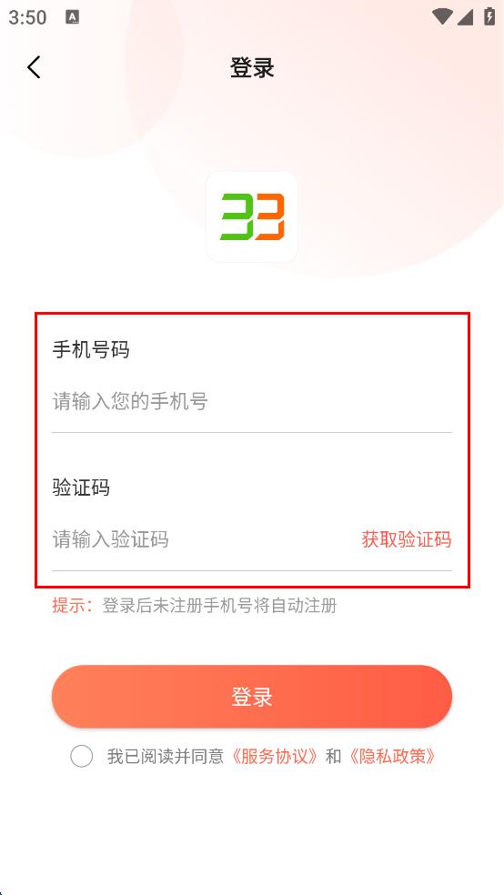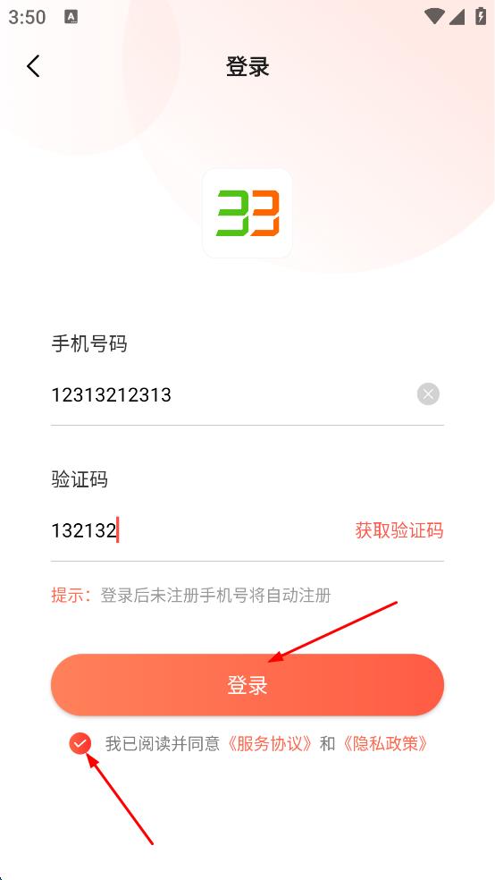 4、輸入手機號和驗證碼后,勾選我已閱讀并同意服務協(xié)議和隱私政策,點擊“登錄”按鈕,完成登錄操作,未注冊賬號會自注冊,可使用APP相關功能。