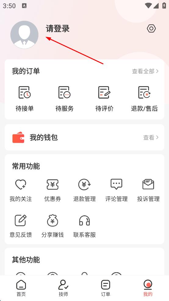 2、進入“我的”界面,界面顯示“請登錄”,還有“我的訂單”“我的錢包”“常用功能”等板塊,點擊“請登錄”。