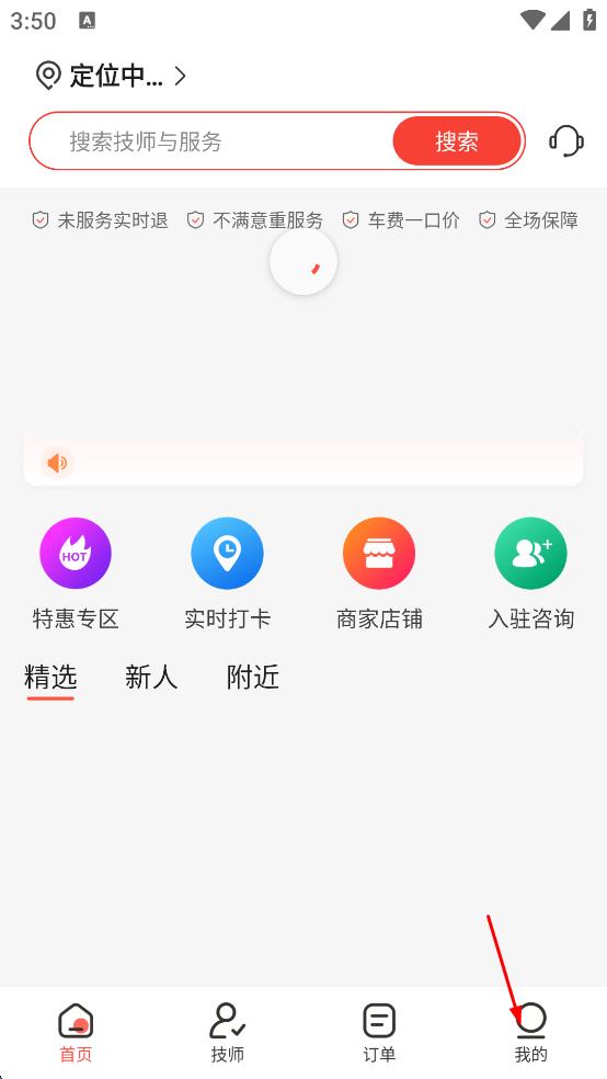 1、打開服務類APP,進入主界面,界面有“搜索技師與服務”搜索欄,還有“特惠專區(qū)”“實時打卡”等功能選項,以及“首頁”“技師”“訂單”“我的”底部選項,點擊“我的”選項。