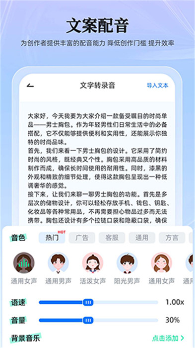 提供文字轉(zhuǎn)換語音功能,可對語音進(jìn)行個性化調(diào)整,還能選擇語音主播,甜美女聲、洪亮男聲、可愛童聲隨意切換。生成的語音支持導(dǎo)出,方便在其他場景使用。