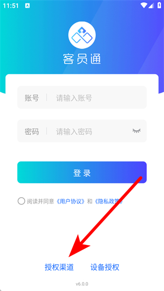 1、打開客員通APP,需要在登錄頁面點(diǎn)擊授權(quán)渠道。