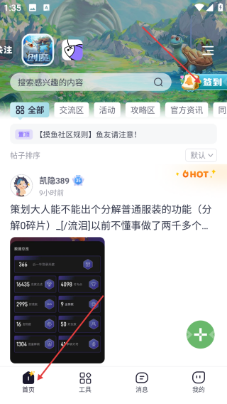 1、打開摸魚社app后,點擊首頁右上角的簽到,進(jìn)入簽到的福利頁面。