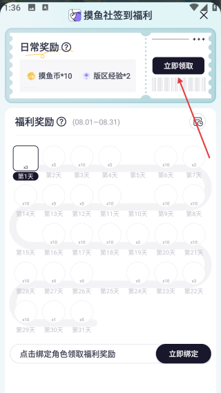 2、打開簽到福利頁面后,點擊上方的日常獎勵,即可領(lǐng)取相應(yīng)數(shù)量的摸魚幣,簽到時長越久,收獲摸魚幣越多。