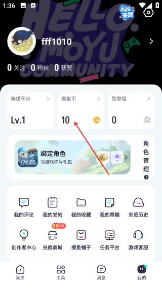 3、進(jìn)入我的頁面后,點擊觀看上方的摸魚幣,可查看領(lǐng)取福利獎勵獲得的摸魚幣。