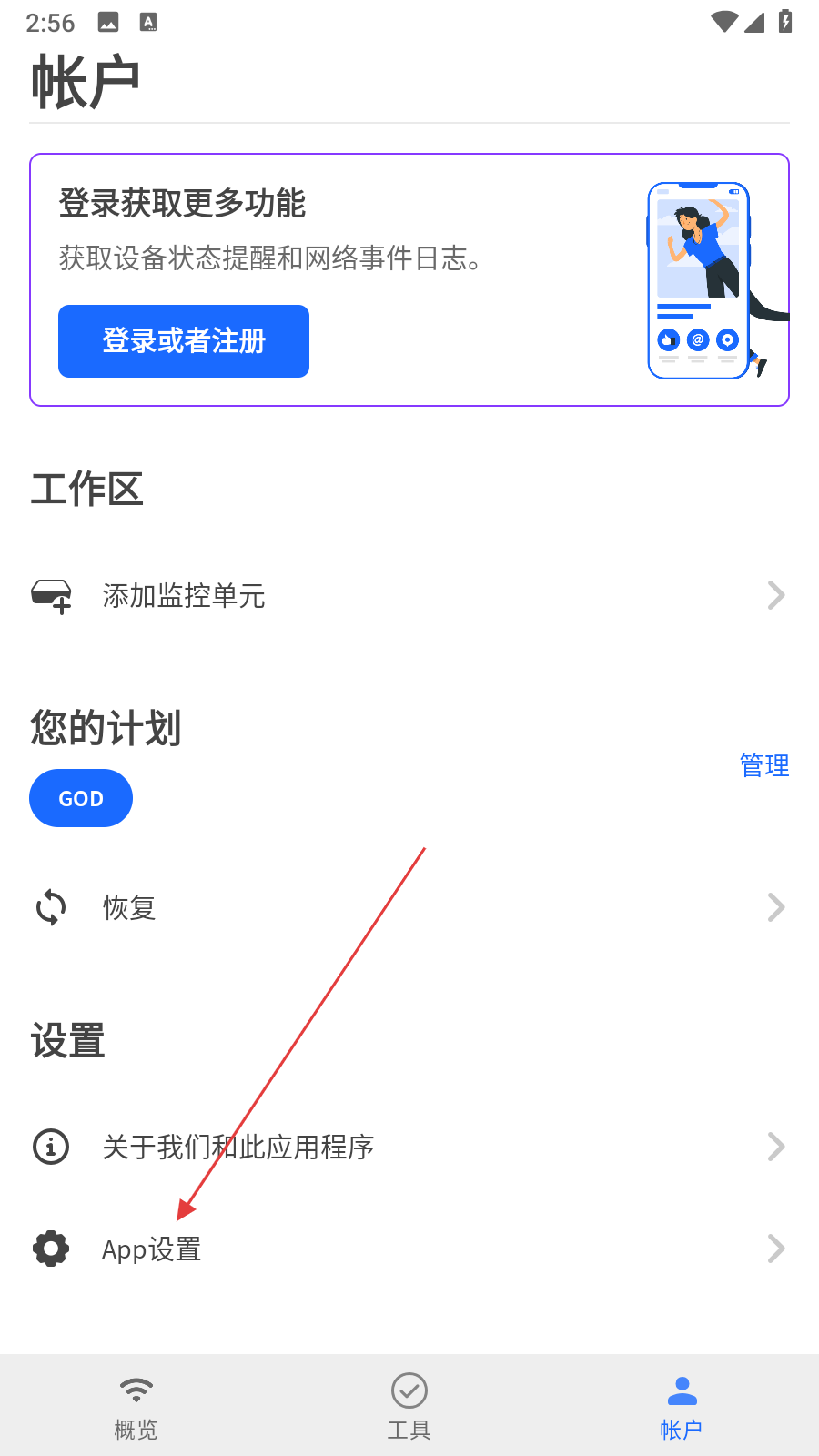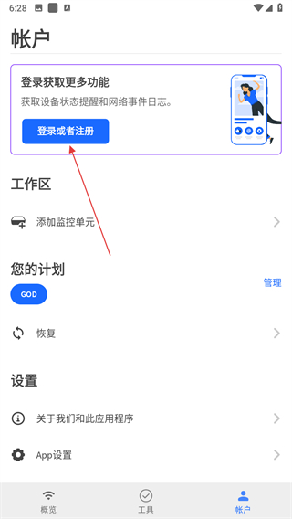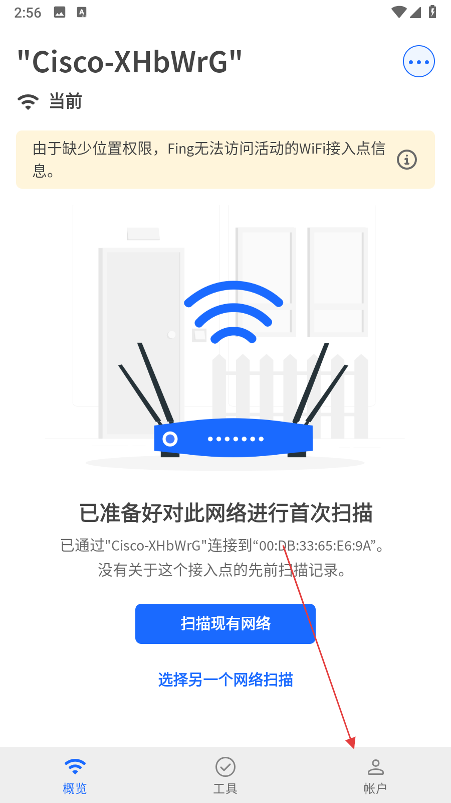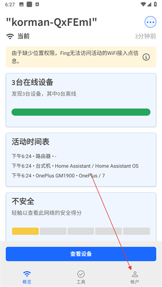 1、打開fing網(wǎng)絡(luò)掃描儀APP,點擊底部導(dǎo)航欄最右側(cè)的帳戶選項,進入帳戶頁面。