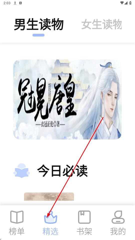 1、打開閱讀APP,點(diǎn)擊底部導(dǎo)航欄中間的精選圖標(biāo),進(jìn)入內(nèi)容推薦頁(yè),頁(yè)面頂部設(shè)男生讀物、女生讀物切換標(biāo)簽,當(dāng)前展示男生讀物分區(qū),含書籍封面、今日必讀模塊。
