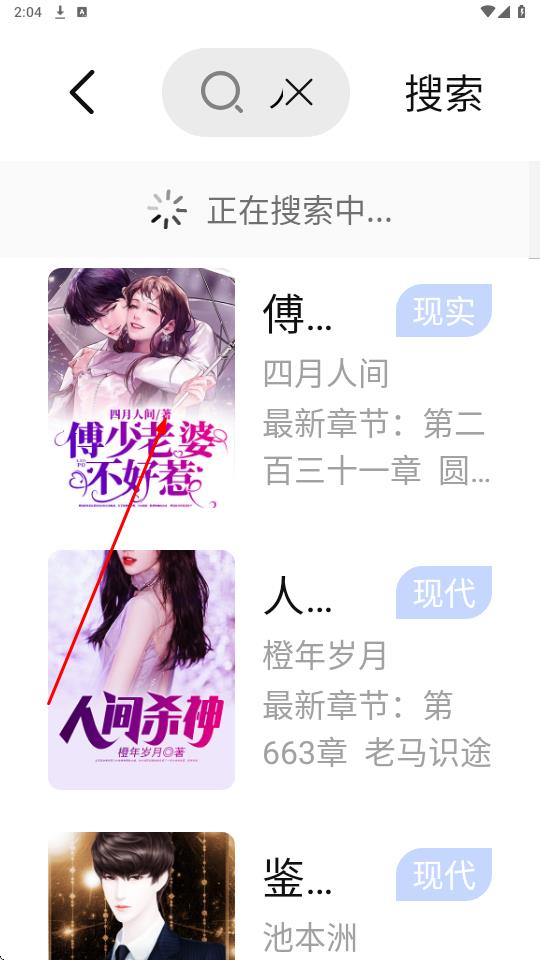 2、點(diǎn)擊頁(yè)面頂部搜索欄,輸入關(guān)鍵詞后觸發(fā)搜索,找到《傅少老婆不好惹》條目左側(cè)顯書籍封面,右側(cè)標(biāo)注現(xiàn)實(shí)分類、作者四月人間、最新章節(jié)信息,點(diǎn)擊該條目進(jìn)入書籍詳情頁(yè)。