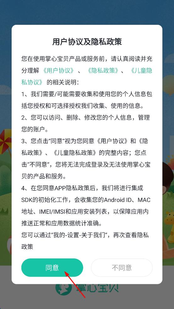 1、打開(kāi)掌心寶貝app,會(huì)彈出用戶(hù)協(xié)議及隱私政策提示框,仔細(xì)閱讀相關(guān)內(nèi)容后,若同意,點(diǎn)擊“同意”按鈕。
