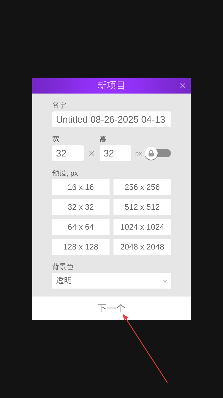 1、打開Pixel Studio應用,在初始界面中,點擊新建按鈕,進入新項目設(shè)置頁面。