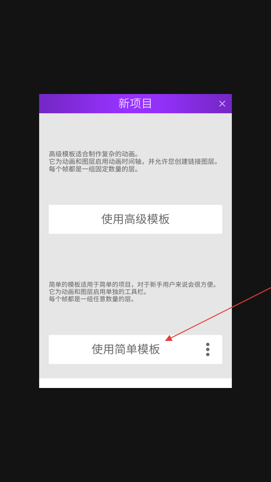 3、隨后會出現(xiàn)模板選擇界面,若制作復雜動畫,可點擊使用高級模板,若為簡單項目且是新手用戶,點擊使用簡單模板,即可成功新建畫布,進入編輯界面開始創(chuàng)作。