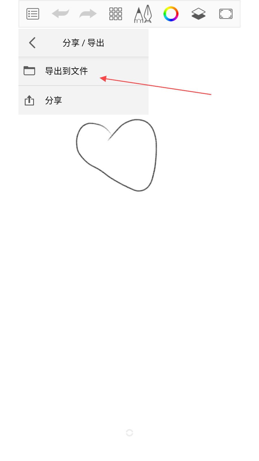 1、在Sketchbook軟件中完成繪圖后,點(diǎn)擊界面上方的菜單圖標(biāo),在彈出的下拉菜單中,點(diǎn)擊分享/導(dǎo)出選項。