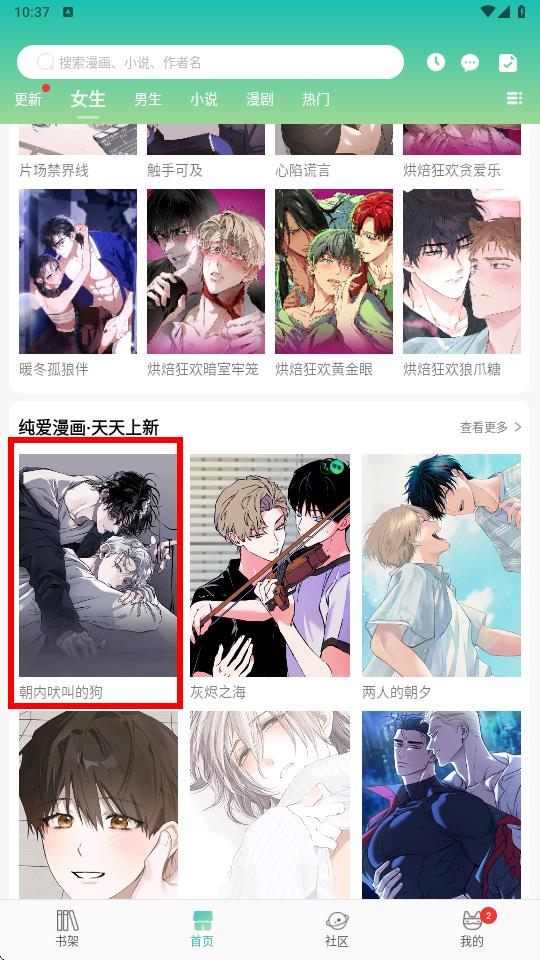 1、打開畫涯app,在首頁找到想要分享的漫畫作品如朝內(nèi)吠叫的狗并點擊進(jìn)入。