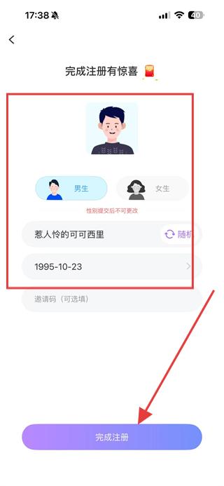 4、選擇性別,設(shè)置昵稱(chēng)和生日,點(diǎn)擊完成注冊(cè)即可完成覓伊賬號(hào)注冊(cè)。