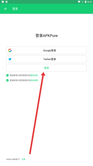 2、在APKPure登錄方式選擇頁,點擊中間的登錄選項,切換至需填寫賬號密碼的登錄界面,推進登錄步驟。